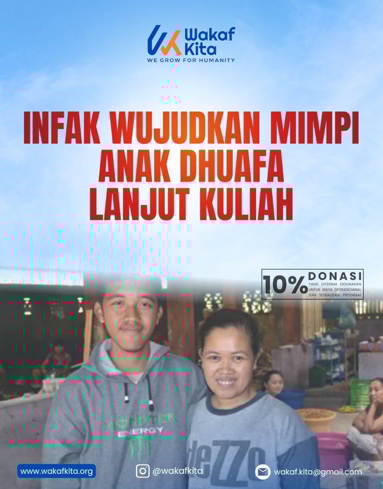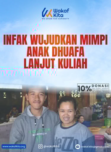 Program Infak Wujudkan Mimpi Anak Dhuafa Lanjut Kuliah adalah bentuk kepedulian nyata terhadap generasi muda dari keluarga kurang mampu yang memiliki semangat tinggi untuk melanjutkan pendidikan ke perguruan tinggi. Banyak dari mereka yang berprestasi di bangku sekolah, namun terhenti langkahnya karena kondisi ekonomi keluarga yang tidak memungkinkan. Melalui program ini, Wakaf Kita mengajak para dermawan untuk menjadi perpanjangan tangan bagi mereka yang ingin mengejar mimpi, namun terhalang biaya.