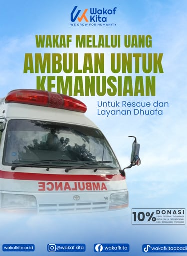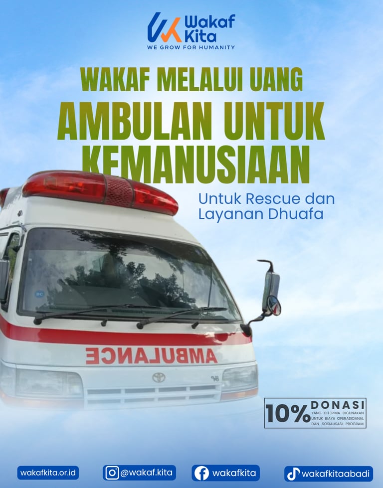 Program Wakaf Ambulans untuk Kemanusiaan adalah bentuk nyata dari kepedulian sosial melalui wakaf uang. Program ini bertujuan menyediakan armada ambulans gratis yang siap digunakan untuk misi kemanusiaan seperti evakuasi pasien, layanan kesehatan bagi dhuafa, dan respons cepat saat terjadi bencana. Ambulans yang diwakafkan akan menjadi sarana vital yang mampu menyelamatkan banyak nyawa, terutama bagi masyarakat kurang mampu yang kesulitan akses layanan kesehatan darurat.