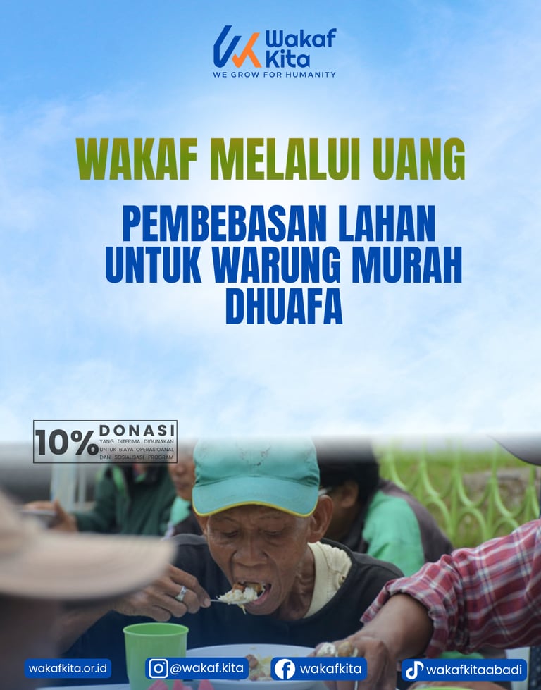 Melalui program "Wakaf Uang untuk Pembebasan Lahan Warung Murah Dhuafa", Wakaf Kita hadir dengan solusi jangka panjang dan berkelanjutan. Kami menginisiasi pembebasan lahan yang akan dijadikan pusat layanan makan bergizi dengan harga sangat terjangkau—bahkan gratis—bagi fakir miskin, lansia terlantar, buruh harian, dan pemulung.