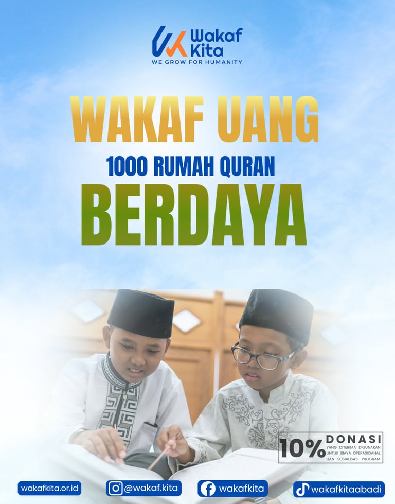 Melalui program “Wakaf Uang: 1000 Rumah Quran Berdaya”, Wakaf Kita mengajak Anda untuk mengambil bagian dalam membangun pusat-pusat pendidikan Al-Qur’an yang bukan hanya berfungsi sebagai tempat belajar, tetapi juga sebagai pusat pemberdayaan masyarakat lokal. Wakaf yang Anda titipkan akan menjadi pondasi lahirnya ribuan Rumah Quran yang aktif, mandiri, dan berdampak luas.